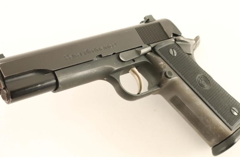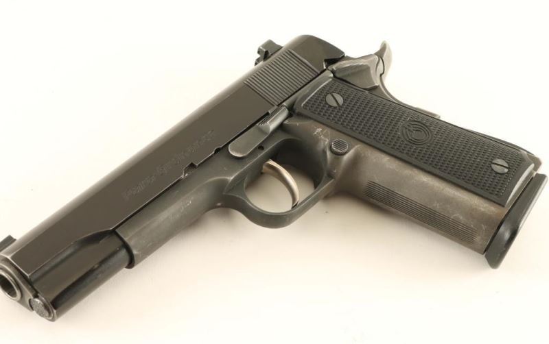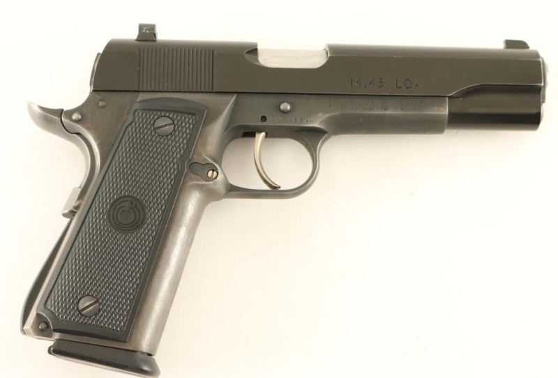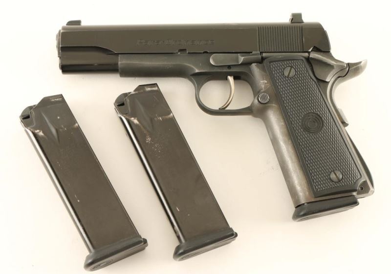 'Light double action' Canadian made high capacity 1911 A1 style semi automatic pistol. Black coated slide, 5" barrel, Trijicon 3 dot night sights, smooth trigger, parkerized steel frame, 14 round factory magazine, thumb safety, beaver tail grip safety, serrated arched mainspring housing, and 2 piece checkered black plastic grips with PO monograms. Includes 2 spare magazines. Approximately 75% finish intact overall, showing holster wear, scattered handling marks, spot of finish wear to the left of the ejection port on the slide, and heavy wear on the grip frame. Action is smooth, bore appears excellent but dirty, and plastic grips are fine. Condition is good+. ***Modern Firearm***