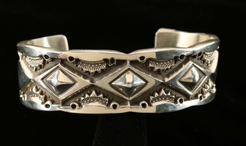 Big Boy Hammered Silver Mens Cuff displays a dimensional tribal design in a premium weight of Sterling. Navajo Jerrold Tahe used a 4lb. ball-peen to create these one of a kind patterns. Guys, this is exceptional mens jewelry! All Sterling, it's about 1" wide, these will fit wrist sizes 6-3/4" to 7-3/4". From the Four Corners of Northern AZ, it's hallmarked by Jerrold. Look closely, isn't this Big Boy Hammered Silver Mens Cuff the one you want. Handmade, each one is considered one of a kind.