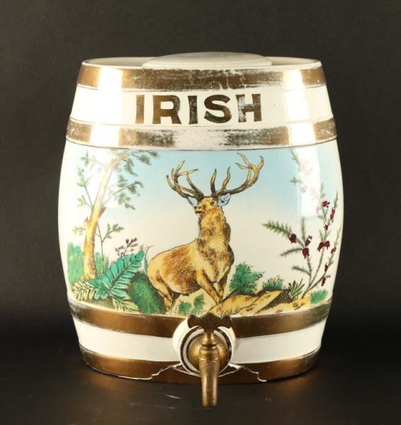 English Mid 19th Century. White ceramic with "IRISH" and stripes in gilt with scenic painting of stag in forest. Comes with ceramic lid and brass spigot. Measures 9"l x 5"w x 11"h. Repaired crack on base and under spigot hole.