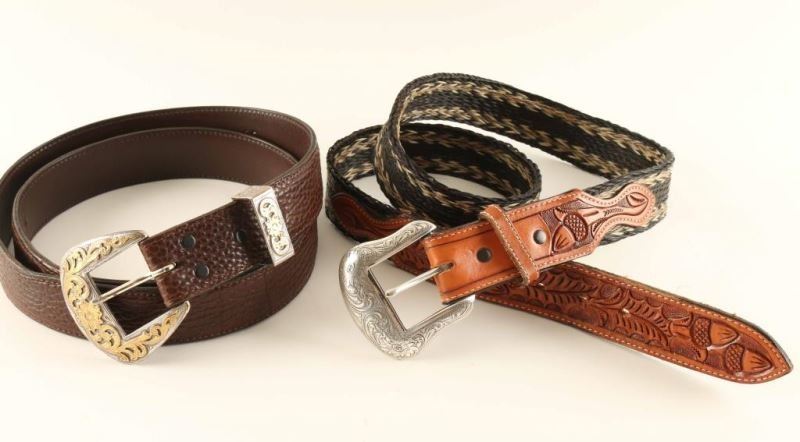 (1) Black and white braided horsehair design with saddle tan ends that have a hand tooled acorn motif. Silver metal buckle has an etched floral motif. (1) Textured chocolate brown leather belt with silver and goldtone floral motif buckle and keeper. Both are size 40.