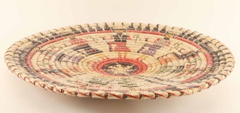 Contemporary style figural and maize motif tray with orange, red, gold, green and purple colors. Measures 21" dia x3"h.