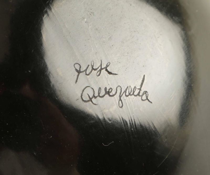 Rounded bottom pot with geometric designs has head, tail and wings of owl. Signed 'Jose Quezada' on bottom. Measures 8"h x 6"dia. Good condition.