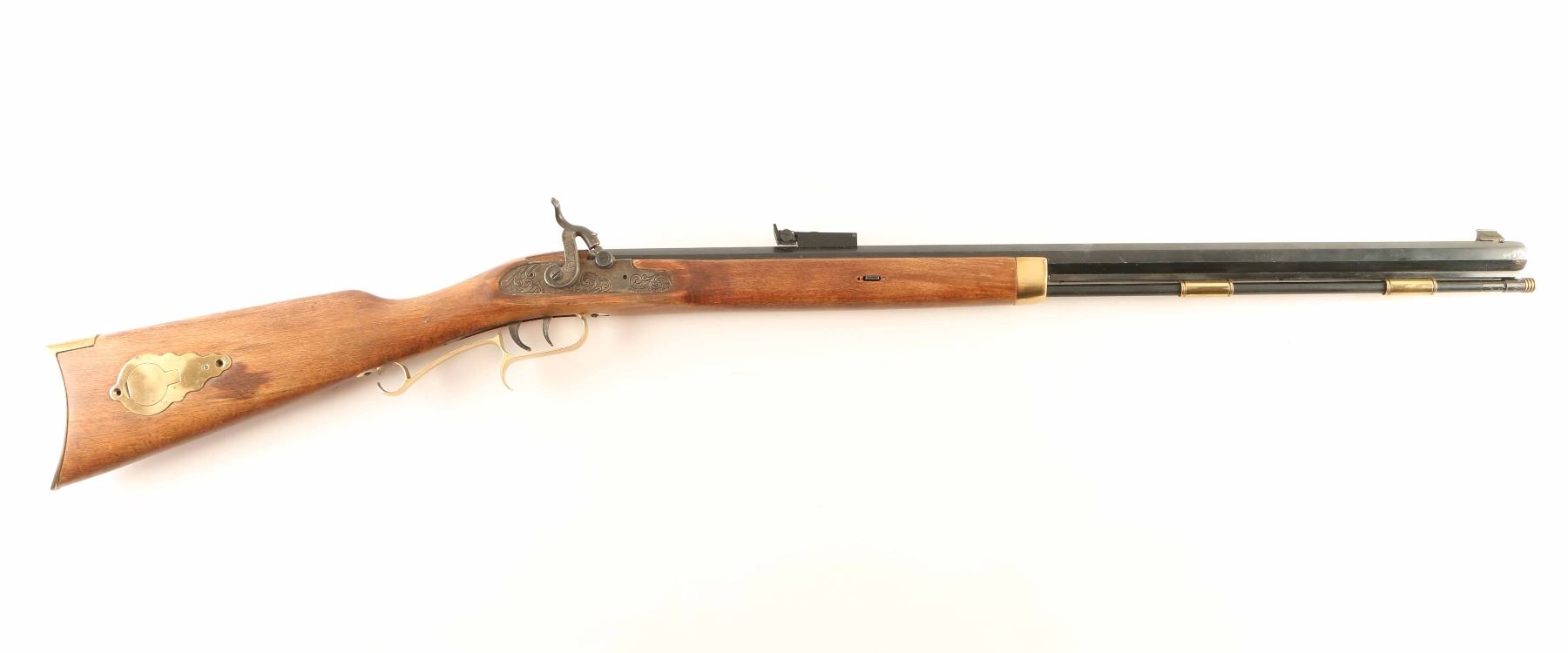 SN: 61-13-048100-98 Modern production Spanish made .50 caliber percussion rifle in classic Hawken style. Features a blued 28" heavy octagonal barrel, blade front sight, adjustable rear sight, double set trigger, black synthetic ram rod, brass furniture, case hardened lock, finger rest trigger guard, patch box, serrated hammer spur, and full-length hardwood straight grip shoulder stock. The barrel retains approximately 93% of it's original blued finish with an area of cleaned pitting near the muzzle and small freckles of surface rust scattered on the left side of the barrel. Action is crisp, bore is clear and wood stock is good. Condition is good to very good. ***Antique Firearm***