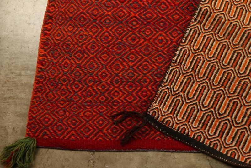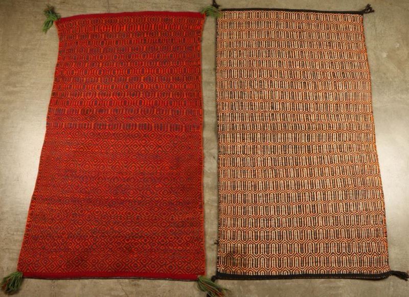 (1) Red orange and black. Minor fraying and some loss to tassels. Measures 50"x27". (1) Black, white and orange, good condition no fraying or losses. Measures 51"x29".