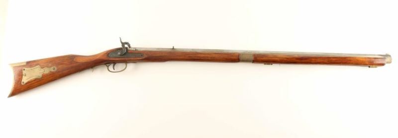 American muzzle loading percussion rifle, chambered for 45 caliber ammunition. Features a 33" octagonal barrel. Blade front sight dovetail rear sight. Engraved case hardened lock with brass furniture including patch box. No ramrod. Two piece smooth wood stock with metal buttplate. Barrel is in the white and shows some pitting towards muzzle. Brass shows a nice patina, case colors are good, wood stock is good with some wear. **Antique Firearm**