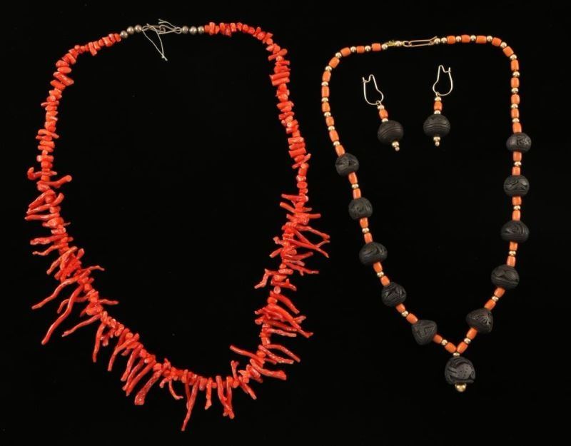 (1) Rustic Native American red orange branch coral on a single strand necklace. (1) Coral and carved black wear necklace and earrings set with animal motif blackwear beads that alternate with small coral and gold beads. Hook and eye closure.