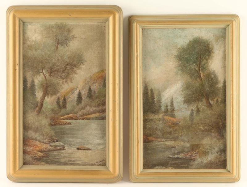 by John Marcellus Moore depicting landscapes. Both measure 13" x 7 1/2" in gold frames. Born near Fort Worth, Texas, he was early exposed to western life because his father started the Abilene Trail. He worked as a cowboy and sketched by the fire at night. He became a Texas Ranger and Indian Scout with General Crook in the campaigns against Geronimo's Apaches. He did a painting of the Grand Canyon for the Santa Fe Railroad. In 1935, he returned to Texas, opening a studio in Wichita Falls, and that year he was designated Official Cowboy Artist of the Lone Star State. A painter of cowboy genre scenes and landscapes, John Moore opened a studio near Yellowstone National Park and painted there for the next 50 years, doing landscape scenes of Wyoming, and Montana as well as Colorado. He was basically self-taught but was encouraged by Frederic Remington.