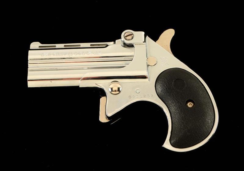 Over/under double barrel spur trigger derringer, bright nickel plated finish, 2 3/4" barrels with faux ventilated top rib, fixed sights, spur trigger, auto rotating barrel selector in the hammer, manual ejector, push button safety and 2 piece textured black plastic grips with DI monograms. Pistol exhibits most of its nickel plating, showing fine superficial scratches. Action is sound, bores are very good+, and plastic grips are fine. Condition is very good. ***Modern Firearm***