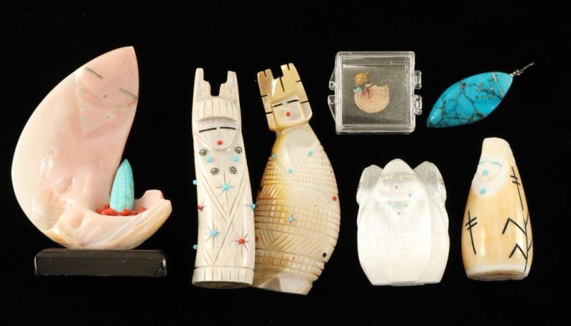 Including; 3 1/4" Mother of Pearl, 3 1/4" antler, 3 1/4" pink shell on base with turquoise stone carved corn and coral beads accent, 2 1/4" shell, 1 3/4" four sided moonstone, 1 1/2" turquoise stone pendant and a tiny wood carved owl Kachina dancer.