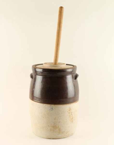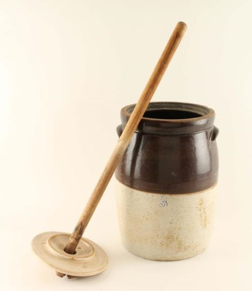 Brown and white pottery churn marked with a '3'. Includes wooden pole with paddle.