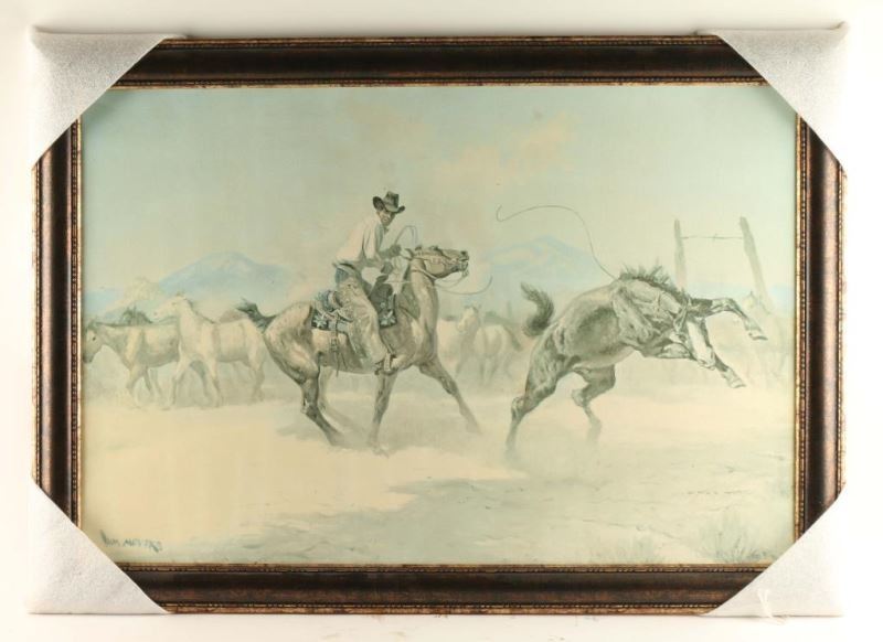 Depicting a cowboy herding horses. Measures 45"x24" in nice bronze colored wood frame.