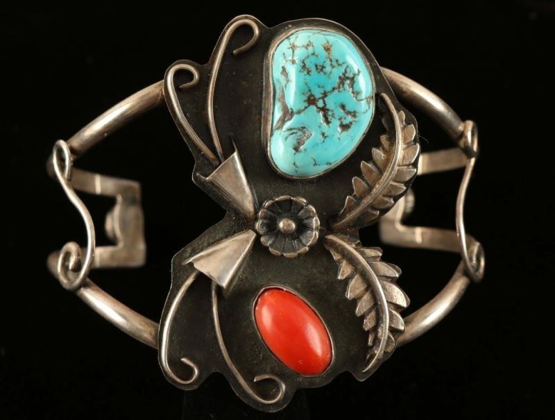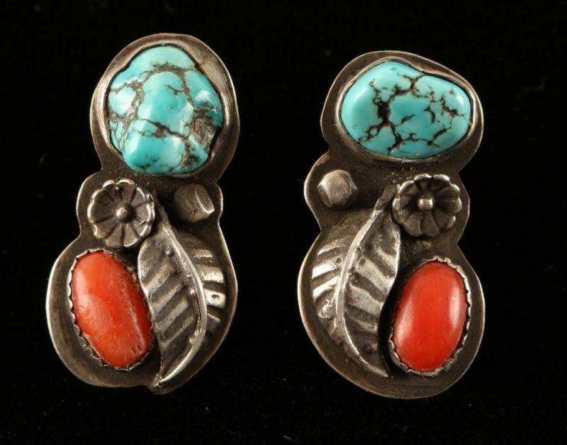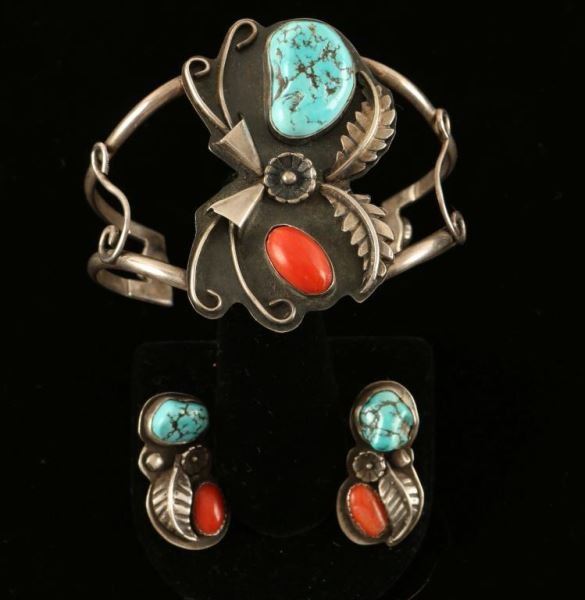 Earrings and Cuff signed "P". Both are very well made by master silversmith. All done in sterling silver with turquoise and coral. Accented with great applique work showing leaves, tendrils, and catus flowers. All are hallmarked with the artists script "P". Earrings are pierced and cuff will fit most.