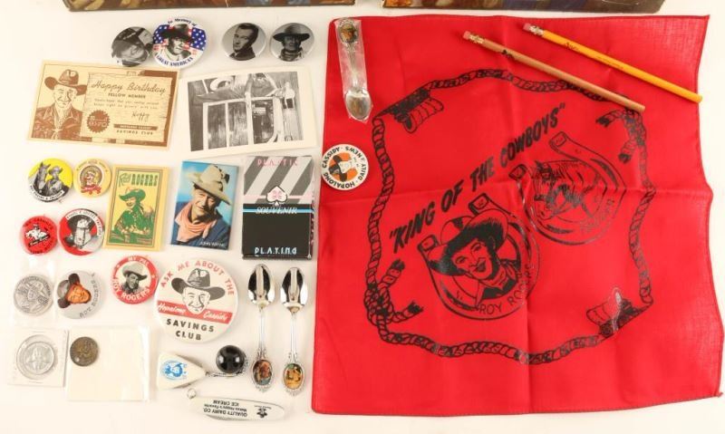 Group of Hopalong Cassidy collectibles includes buttons, pins, marble, postcards and knife. Group of Roy Rogers and Dale Evans collectibles includes buttons, pins, spoons, pencil coin, knife, bandana, and mirror. Also includes is John Wayne collectibles includes playing cards, pins, buttons, spoon, and mirror. Also included two children's puzzles featuring Gen Autry, one with Champ 15"X11.5 In good used Condition.