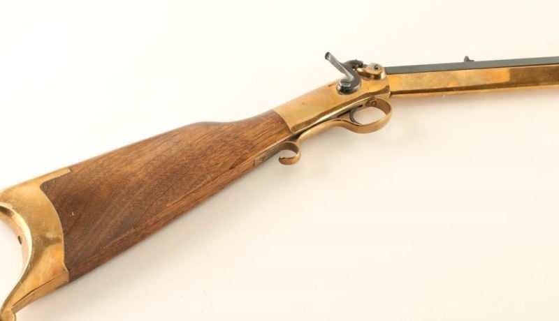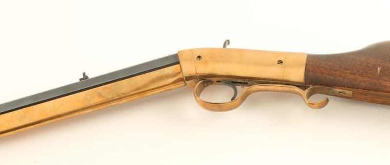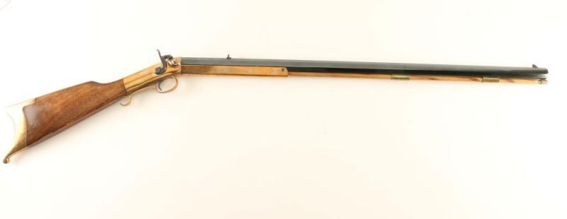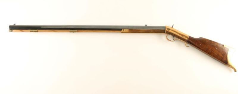 Quality reproduction of the Allen & Thurber muzzle loading black powder rifle with .54 caliber bore, produced in Olney, Texas. Blued 31 1/2" heavy octagonal barrel, dovetailed open sights, wood ram rod, smooth wood shoulder stock and brass frame, forend, triggerguard, furniture, & buttstock. The barrel retains approximately 90% of it's bright blued finish showing slightly rounded edges, some minor imperfections under the finish and some scattered light surface rust & scratches. Action is crisp, bore is excellent and wood stock is good with several blemishes. Condition is very good. ***Antique Firearm***