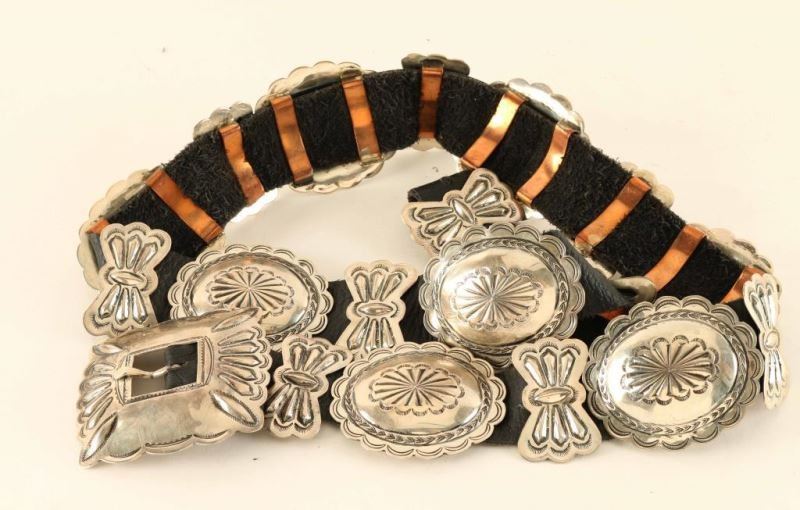 Nine oval floral motif conchos alternate with ten silver butterfly shape conchos. Large square scalloped buckle with teardrop design.
