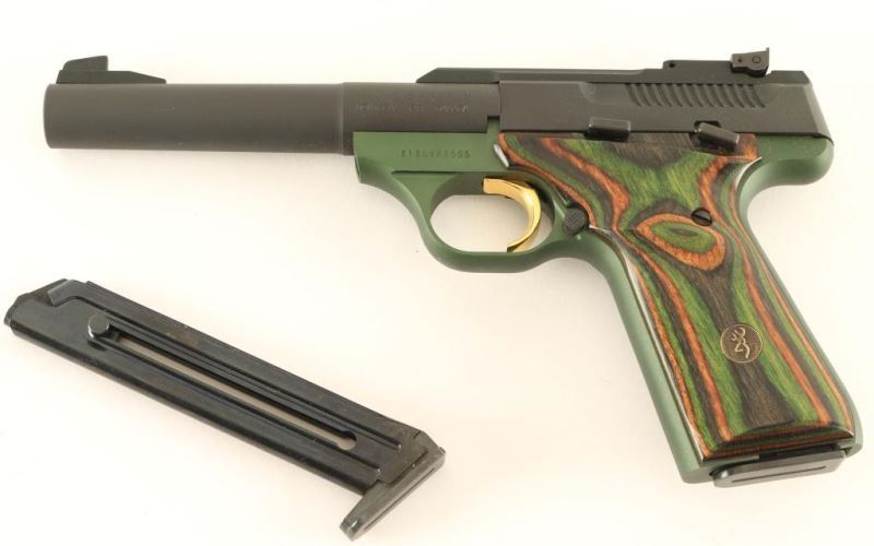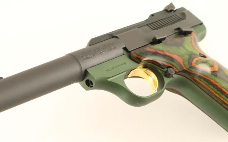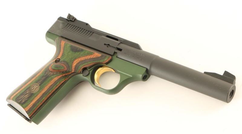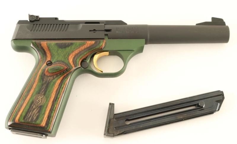 'Forest Green Camper' Semi-automatic pistol with matte black & green finish, 5 1/2" bull bbl, patridge front sight, adjustable rear window sight, gold trigger, thumb safety, 10 round magazine, and two-piece 'camo' laminated wood grips. Includes the original factory hard case with documents and spare magazine. Pistol exhibits little to no visible wear. Action is sound, bore is excellent and wood grips are fine. Condition is excellent in case. ***Modern Firearm***