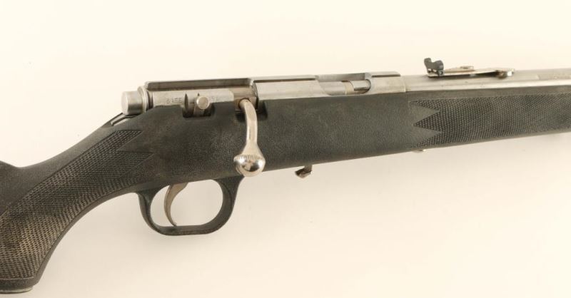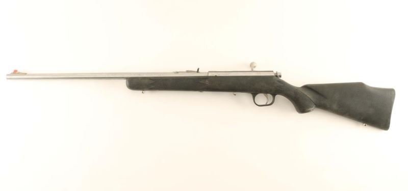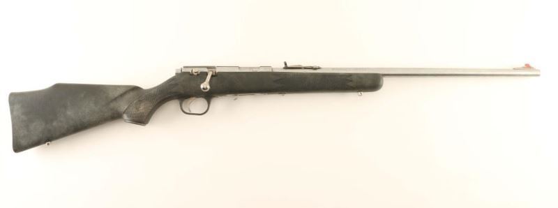 Marlin 880 stainless .22 LR Bolt-action rifle accepts a 7 shot detachable magazine, 22 in. barrel, receiver grooved for scope mount. Semi-buckhorn rear sight, front sight has orange insert; stainless steel sling swivel studs. Bore is bright with strong rifling. Overall good condition. Stainless steel barrel and receiver with black fiberglass synthetic stock, Missing magazine. Mfg. 1994-2003. *Modern Firearm*