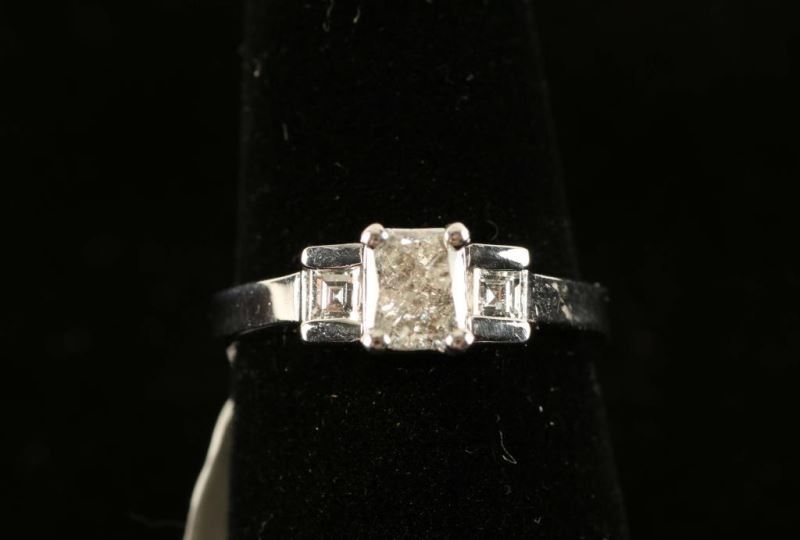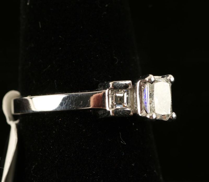 Radiant cut center diamond is flanked by a princess cut diamond on either side. Set in 14K white gold. Size 6.