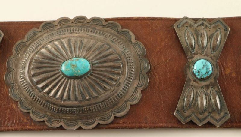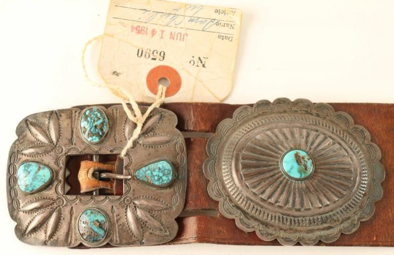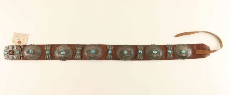 33" long, 2 1/2" wide. Six oval, scalloped and repousse conchos, each 3 1/4" with center turquoise stone and 2 1/2" butterfly spacers. Square buckle with four stones. Fine condition, circa 1950. Attached is an old pawn ticket Sam Charlie 1954.