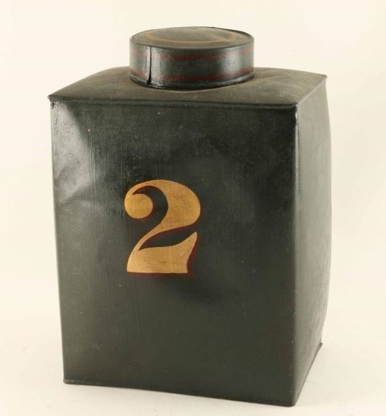 Rectangular green tin canister with a round lid. "T Pilkington & Co., COFFFEE, 89 Witechapel Liverpool" in gold lettering with red accents on the front with a number "2" on the back. Very good condition, possible repainted per consignor. Measures 8"l x 5 1/2"w x 11 1/2"h.