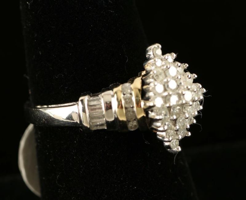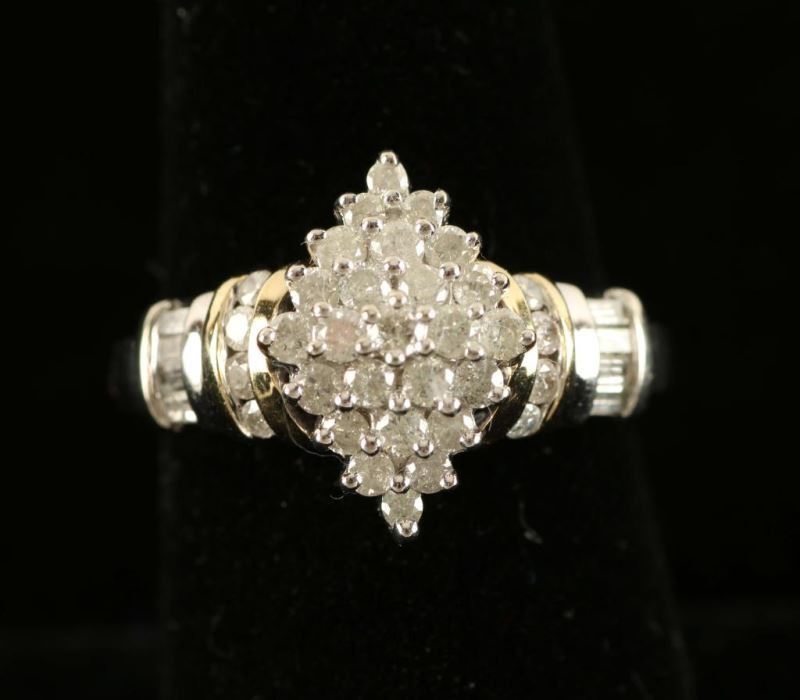 Twenty five round cut diamonds make up a center pattern that is flanked by four more round cut diamonds and four baguettes. Set in 14K white gold, size 6 1/2 Very flashy presentation.