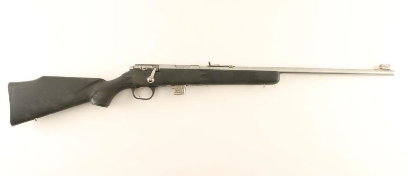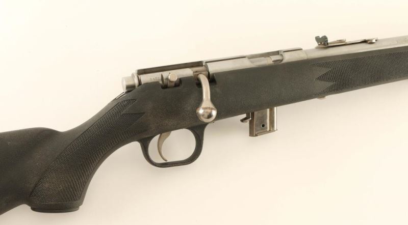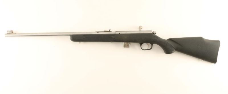 Marlin 880 stainless .22 LR Bolt-action rifle with a 7 shot detachable magazine, 22 in. barrel, receiver grooved for scope mount. Semi-buckhorn rear sight, front sight is hooded with an orange insert; stainless steel sling swivel studs. Bore is bright with strong rifling. Overall good condition. Stainless steel barrel and receiver with black fiberglass synthetic stock. Mfg. 1994-2003. *Modern Firearm*