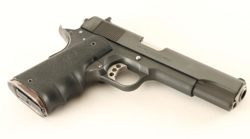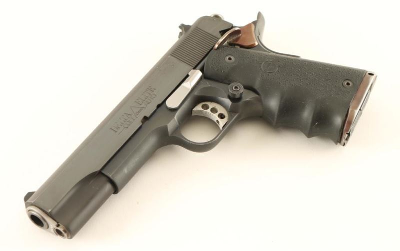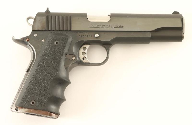 'Pre-Enhanced' Customized 1911-A1 style single action semi-automatic pistol chambered in 10mm Automatic, circa 1988-1992. Features a blued finish, 5" barrel, Brown barrel bushing, full length steel guide rod, three-dot sights, serrated adjustable trigger, aftermarket thumb safety, enlarged beavertail grip safety, skeletonized hammer, oversized push button magazine release, factory 8 round magazine, serrated straight mainspring housing with beveled magazine well and Hogue one-piece pebbled black rubber wrap-around finger groove grips. Includes the factory grips and two spare magazines. Pistol exhibits approximately 90% of it's blued finish showing heavy wear on the grip straps and scattered handling marks/scratches on the side of the frame & slide. Action is strong, bore is excellent and grips are fine. Condition is very good. ***Modern Firearm***