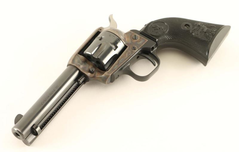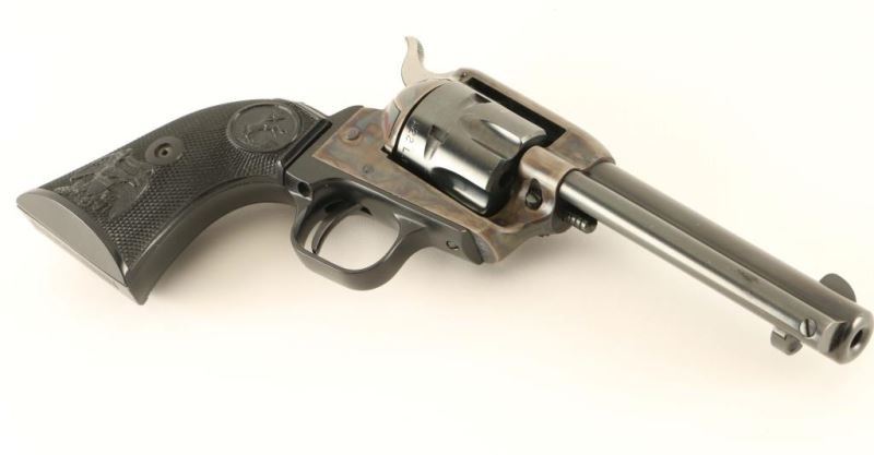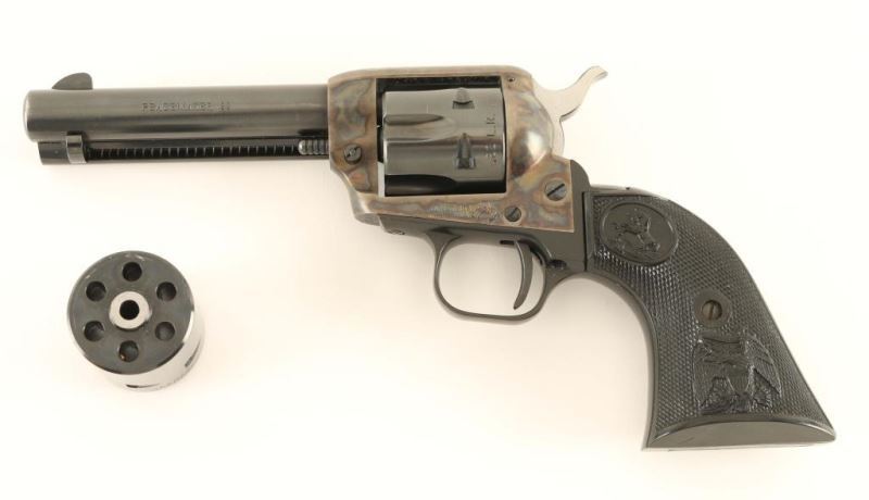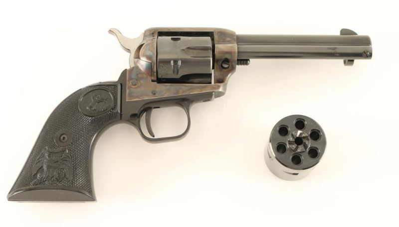 Small frame single action revolver chambered in either .22 Long Rifle or .22 Magnum, circa 1974. Features a blued 4 3/8" barrel, blade front sight, square notched rear sight, ejector rod, fluted six-shot cylinder, case hardened frame, black finished alloy grip frame, checkered hammer spur and Colt two-piece checkered black hard rubber federal eagle grips. Includes the original factory wood grain cardboard box with inserts, documents and un-fluted .22 Mag cylinder. Revolver exhibits approximately 94% of it's original finish showing light muzzle wear and some scattered losses. Action is crisp, bore is excellent and grips are fine. Condition is near excellent in box. ***Modern Firearm***