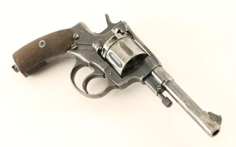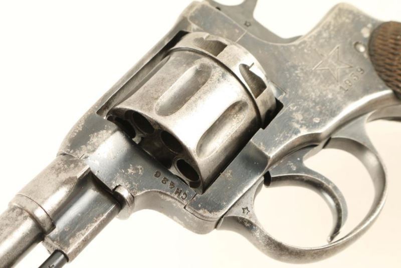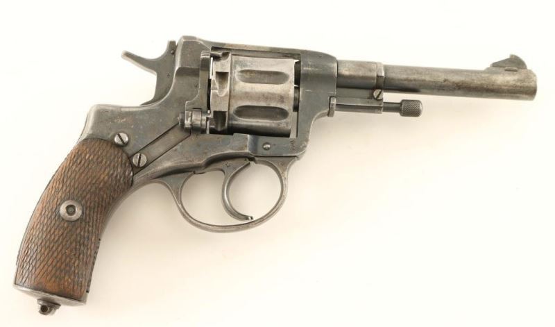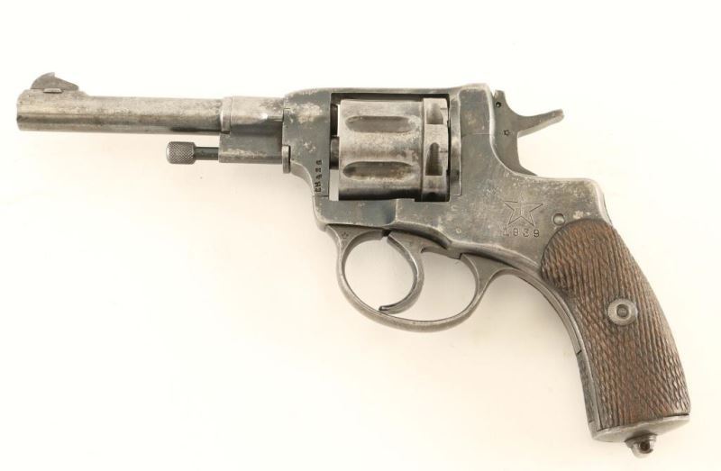 Russian military D.A. 'Gas Seal' revolver chambered in 7.62x38Rmm, produced at the Tula Arsenal circa 1939. Features a blued finish, 4.5" barrel, swing-out ejector rod, dovetailed patridge front sight, 'u' notched rear sight, fluted seven-shot cylinder, smooth trigger, knurled hammer spur, flip-down loading gate, no lanyard ring and checkered wood grips. Revolver retains approximately 55% of it's original blued finish showing heavy holster wear and some scattered minor pin prick pitting. Action performs well, bore is fair to good with some scattered pitting and wood grips are good with worn checkering and a chip to the piece in the backstrap. Condition in good. ***C&R Firearm***