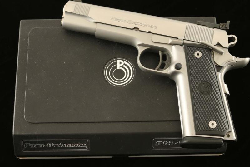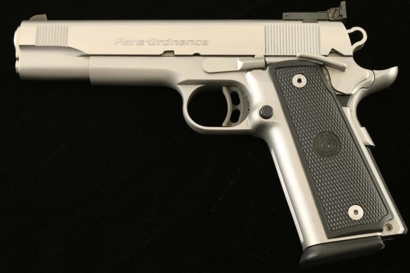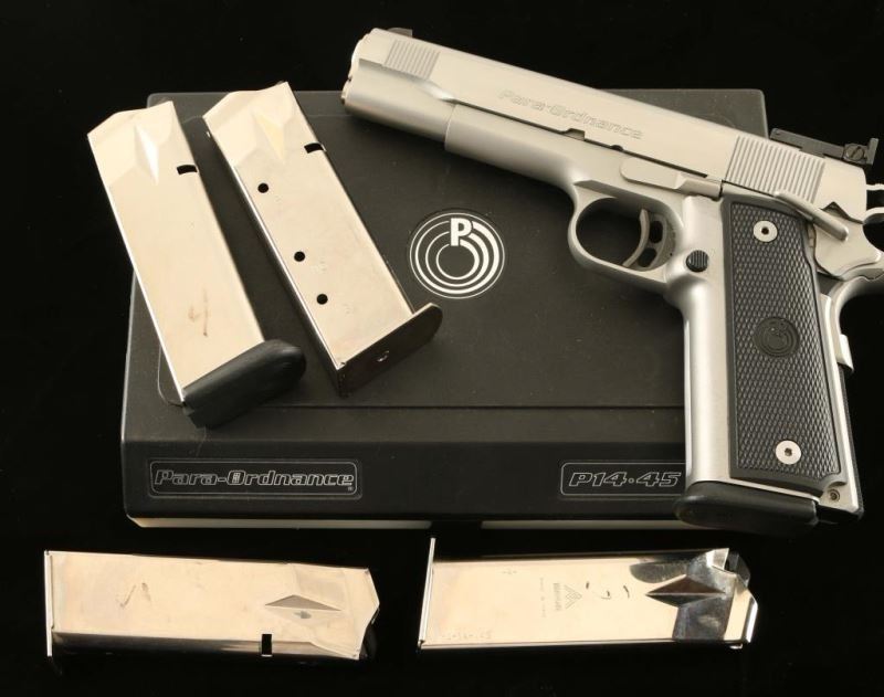 Canadian made stainless steel high capacity 1911-style single action semi-automatic pistol chambered in .45 Auto. Brushed & satin finish, 5" barrel, patridge front sight, dovetailed adjustable rear window sight, ambidextrous thumb safety, serrated trigger, beavertail grip safety, skeletonized hammer, push button magazine release, factory magazine, knurled mainspring housing & Para Ordnance two-piece checkered black plastic grips. Includes the original factory hard case with documents and four extra magazines. Pistol exhibits very little wear with some minor scratches & light scuffs. Action is strong, bore is excellent and plastic grips are fine. Condition is excellent in box. ***Modern Firearm***