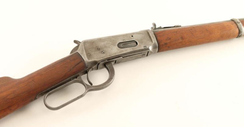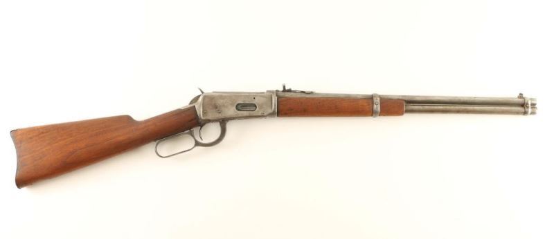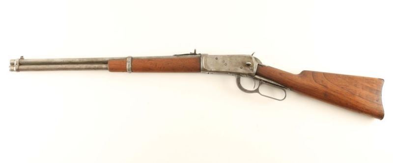 Early 'SRC', circa 1897. 20" bbl, full-length tube magazine, two barrel bands, blade front sight, King adjustable semi-buckhorn rear sight, no saddle ring, and smooth walnut stock with metal carbine buttplate. Rifle is in-the-white with a light brown patina forming. Mostly good markings, crisp action, very good bore and poor stocks. Condition is fair. ***Antique Firearm***