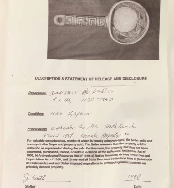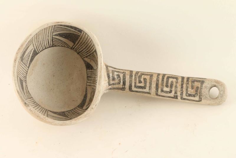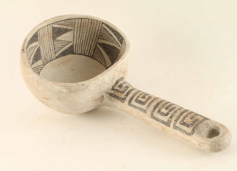 White with black polychrome finish with a beautiful geometric design, 1150-1250 AD,9" X4 1/2". From the Apache County, AZ Smith Ranch Found 1998.