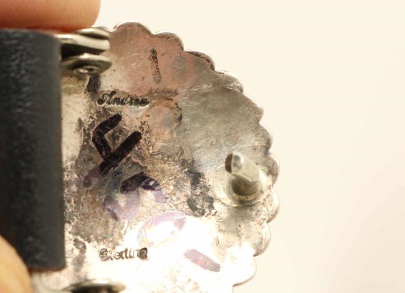 Ten small silver circle conchos with scalloped edges and floral motif hold a single center turquoise cab that alternate with 8 silver butterfly spacers. Pretty and petite.