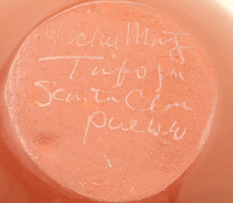 Beautiful terra cotta glazed pot with swirl and arrow motif. Signed on bottom 'Vickie Maj Tafuya Santa Clara Pueblo'. Measures 5 1/4"h x 5"dia. Good condition