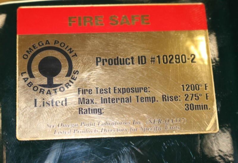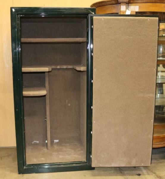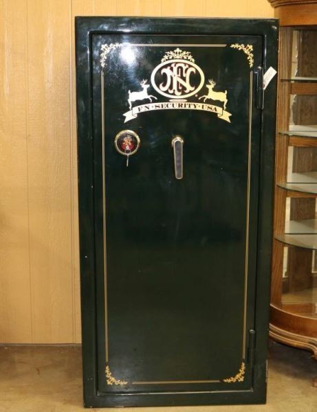 Product ID 10290-2 fire test exposure 1200 F for 30 minutes, Three carpeted shelves and a rack for 12 long guns. Green painted exterior with gold trim and FN Security logo on front. Measures 5' h x 29"w x 26"d.