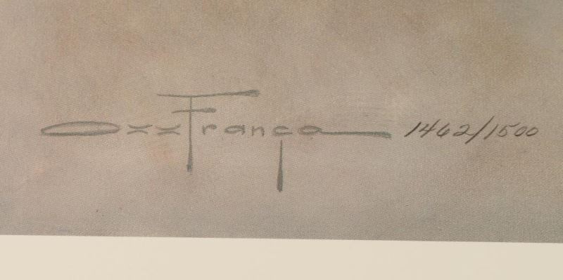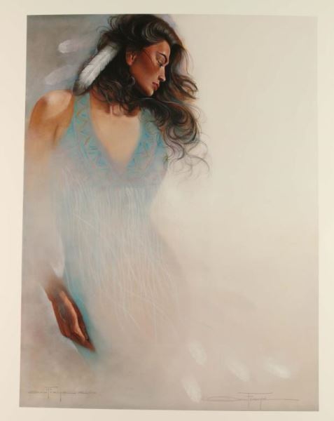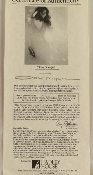 "Blue Navajo" Limited Edition Print. Signed by the artist lower right. This is a highly collectible print. This well made fine art print is of the Ozz Franca pastel painting "Blue Navajo". The image depicts a Native American woman emerging like a spirit out of the white nothingness of the canvas. She looks somberly downward with a touch of sadness in perfect profile. This is a great work of art, and it is of a limited edition of 1500. The printing plates have been destroyed, so there will be no more. This print is 28-3/4" x 22-1/2". Don't miss this once in a lifetime opportunity!