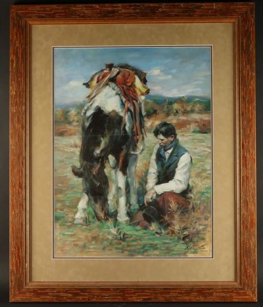 This Cowboy with Horse Framed Print is a faithful reproduction of the original painting by artist, Wei Tai. Signed and numbered, 221/1000, this was made for the Arizona Carefree Fine Art & Wine Festival in 2002. Depicting the beauty of companionship between a man and his animal, this custom framed piece features a suede top mat and a rugged wood frame that truly complements the theme. Outside dimensions are 30-1/2" wide x 37" tall and it's double matted under conservation glass, so all you'll need is the nail to hang it on. In very good condition with the limited edition certificate mounted on the dust cover. This Cowboy with Horse Framed Print is one of a kind!