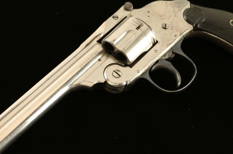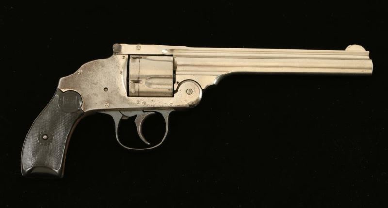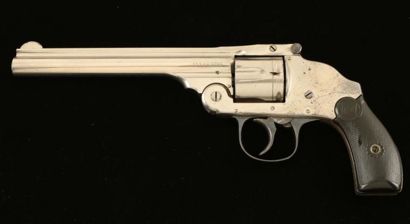 .38 S&W NVSN Vintage D.A.O. top break revolver, circa 1905-1941. Features a nickel plated finish, 6" ribbed barrel, round blade front sight, 'u' notched rear sight, fluted five shot cylinder, smooth trigger, and checkered black hard rubber grips with target decor. Revolver exhibits approximately 70% of it's original nickel plated finish showing heavy losses on the right side of the frame and on the grip straps. Action is smooth with play in the lock-up, bore is excellent and hard rubber grips are very good. Condition is very good. ***C&R Firearm***