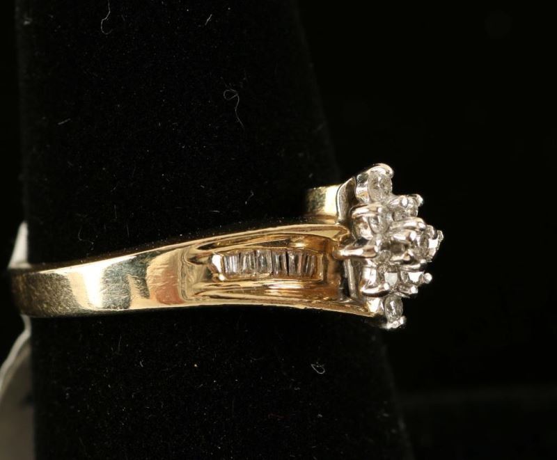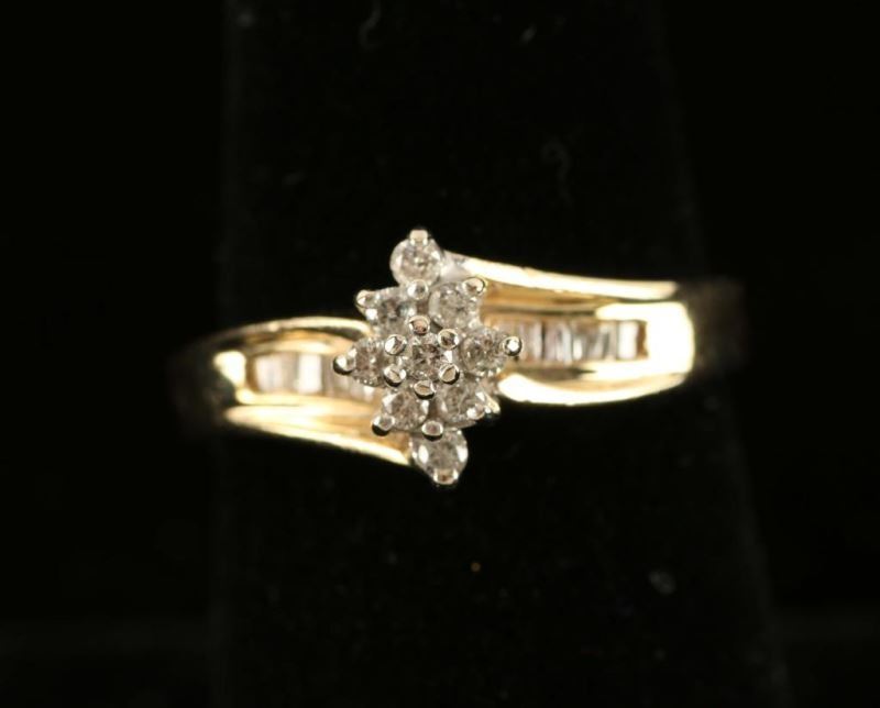 Eight small round diamonds surround a center diamond in a floral motif with baguettes down each side of the band. Set in 10K yellow gold, size 6 1/2.TCW .25, Very dainty.