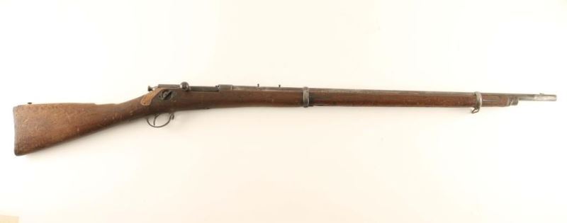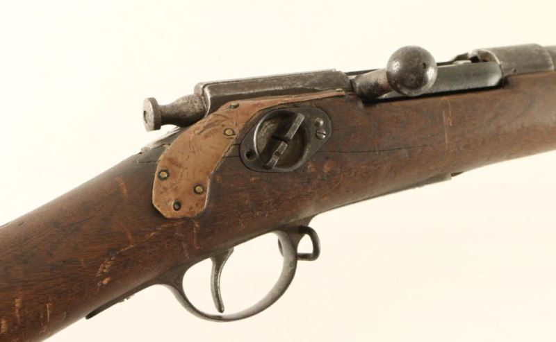 Winchester Hotchkiss M 1879 First model. Barrel length: 32”, no cleaning rod, sights, or magazine assembly. Bore is dark. Parts gun. The Hotchkiss, like most early bolt-actions, had a single rear locking lug integral with the bolt handle, but was unique in feeding multiple rounds from a tubular buttstock magazine similar to the Spencer rifle. *Antique Firearm*