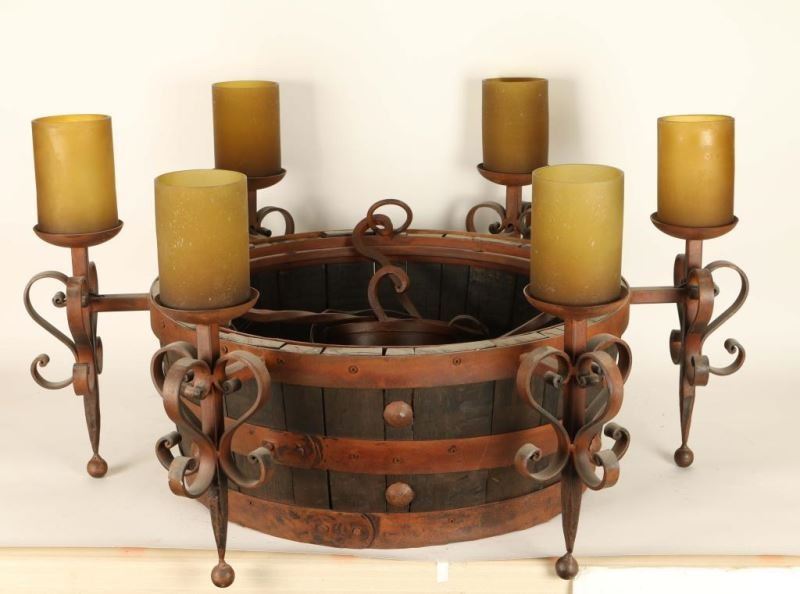 Center of chandelier is a metal banded barrel accented with rustic wrought iron. Six lights with amber colored glass shades, must be hard wired in. Measures 39"w x 19"h approx.