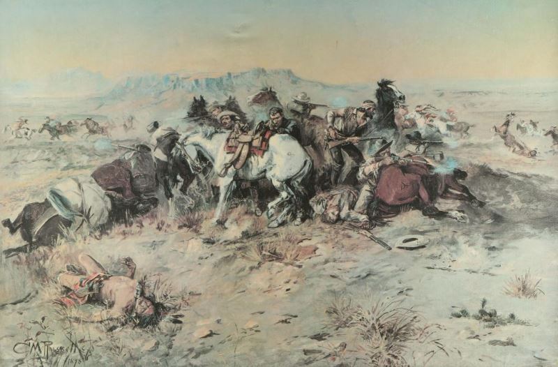 Depicting cowboys behind their horses in battle surrounded by Native Americans. In rustic wooden frame with linen inset. Image measures 24" x 34 1/2". Small indent in canvas on the top right.