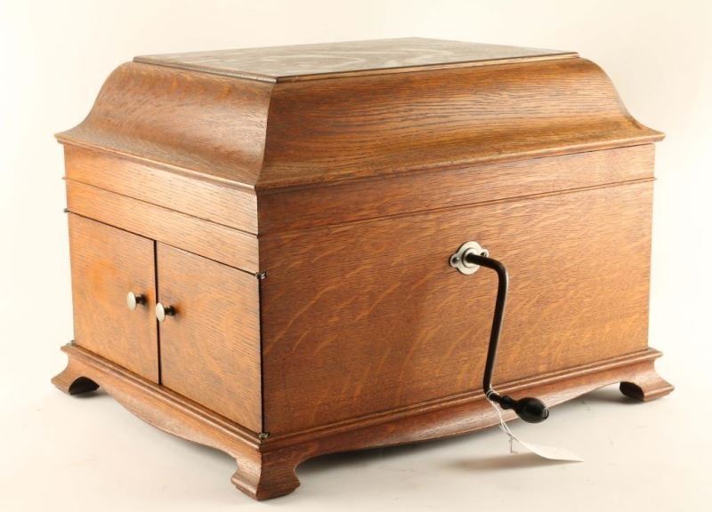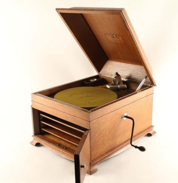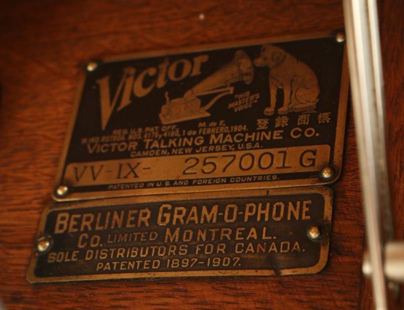 Beautiful oak cabinet with 'Victor Talking Machine' decal with famed dog at the Victrola on inside of lid. Crank operation with flip over needle, speed settings and on/off switch. Plate inside reads 'VV-IX 2570016, Berliner Gram-O-Phone Co. Montreal, Patented 1897-1907' Two front cabinet doors open to three shelves for storage. Silver metal hardware. 18 1/2"w (with handle) x 20 1/2"d x 14 1/2"h. Very good condition, only a few scratches on top of cabinet.