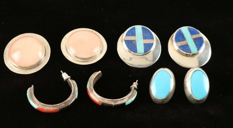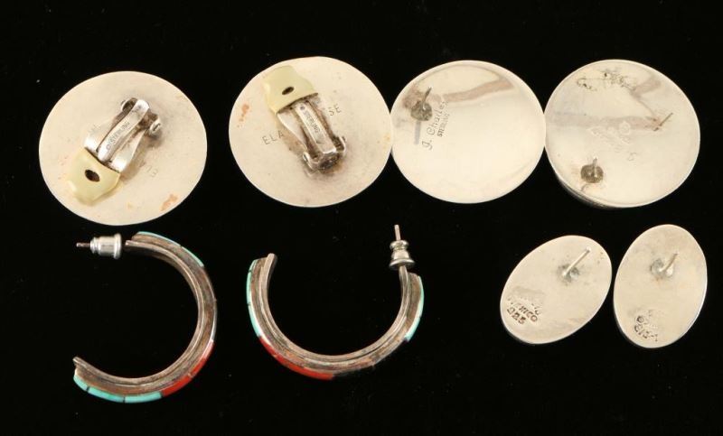 Including an Elaine Rose pink stone clip ons, Zuni inlaid hoops, pair of lapis and turquoise marked 'J Charley' and a pair of turquoise Mexican post earrings.