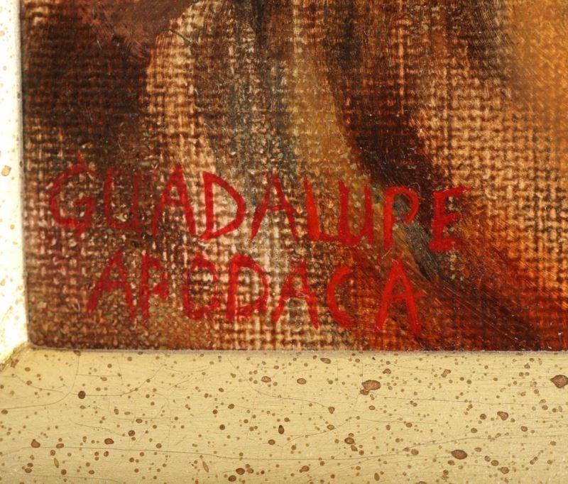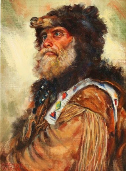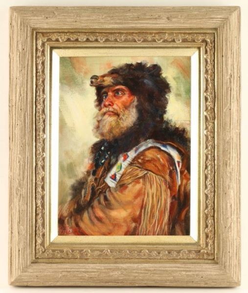 "Yukon Man" by Guadalupe Abodaca, signed lower left. Image measures 11 1/2"x8 1/2"in wood frame with gold insert. This painting is from the Miniature Masterpieces Show 2007 at the Phippen Museum in Prescott, AZ. A pastel and oil painter of landscapes, figures, and portraits in an impressionist style, Guadalupe Apodaca was born in Fort Collins, Colorado and lived for many years in Sedona, Arizona. He moved to Denver in the late 1990s, and is a long-time member of the Pastel Society of America. Guadalupe began drawing and painting at the age of three and has said his most influential art teacher was George Cherepov who encouraged him to paint landscapes in Portugal, Spain, and Mexico as well as the American Southwest.