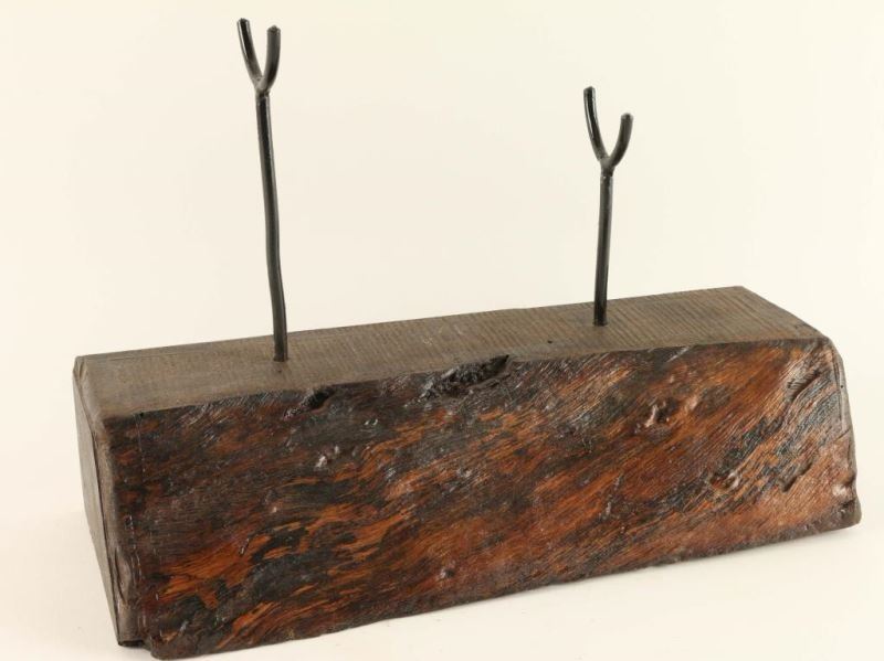 Natural stained wood front with a nice grain pattern. Two metal holders for handgun. Measures 12"l x 5"w x 8 1/2"h. Made by a local AZ artist.