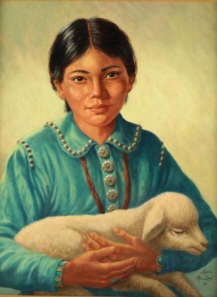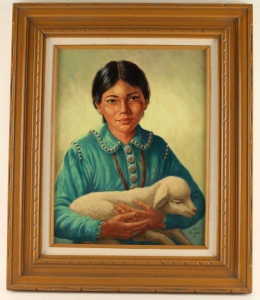 Depicting an Indian girl and a lamb, entitled "In Safe Keeping", signed lower right hand corner, measures 14"x18",