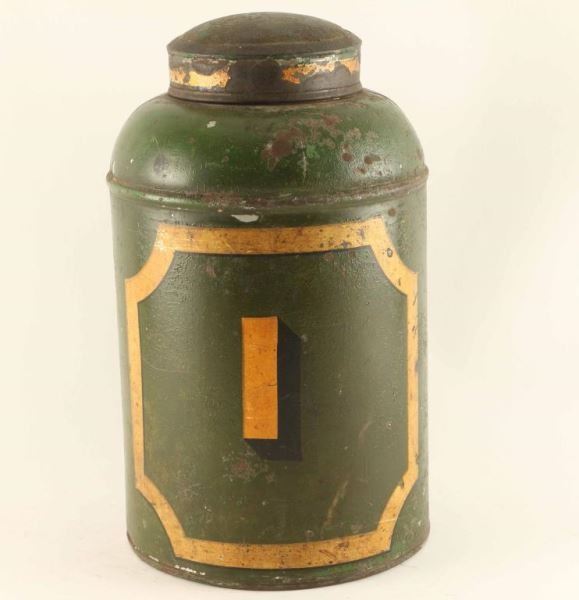 Round green tin with a round domed lid. Number "1" in gold and black with a gilt and black border. Shows age and some rust. Measures 13 1/2"h x 8"dia.