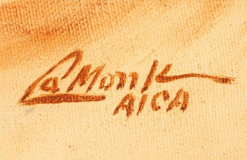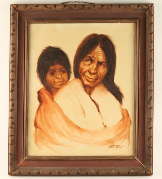 Charles LaMonk artist depicting a portrait of a Sioux mother and child. Signed lower right, image measures 20"x15 1/2" in wood frame. Born in Kemmerer, WY on April 22, 1910. LaMonk settled in Palmdale, CA at an early age. He studied at Chouinard Art Institute and privately with Will Foster. He specialized in recording the Indians of Mexico as well as the caves and canyons of the Southwest. He died in Los Angeles on Aug. 9, 1990. Exh: Allied AA (Antelope Valley), 1963.