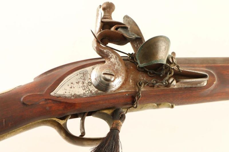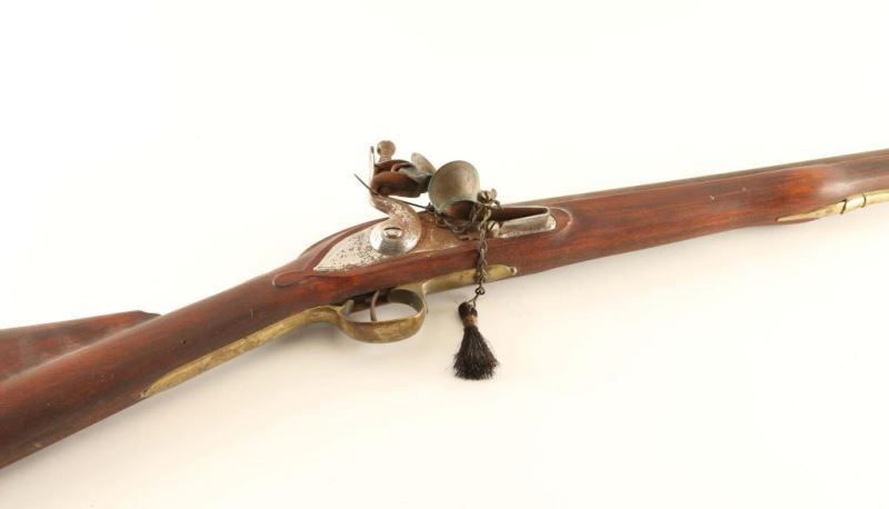 Japanese made muzzle loading flintlock rifle with an approximate .75 caliber bore. Browned 41" barrel, block front sight, metal ram rod, brass furniture, and one-piece contoured wood stock. The Tower marked lock plate was finished in-the-white and now shows heavy rust. The remaining steel parts also show some light scattered surface rust. Action is sound, bore is good and wood stock is very good. Condition is near good. ***Antique Firearm***